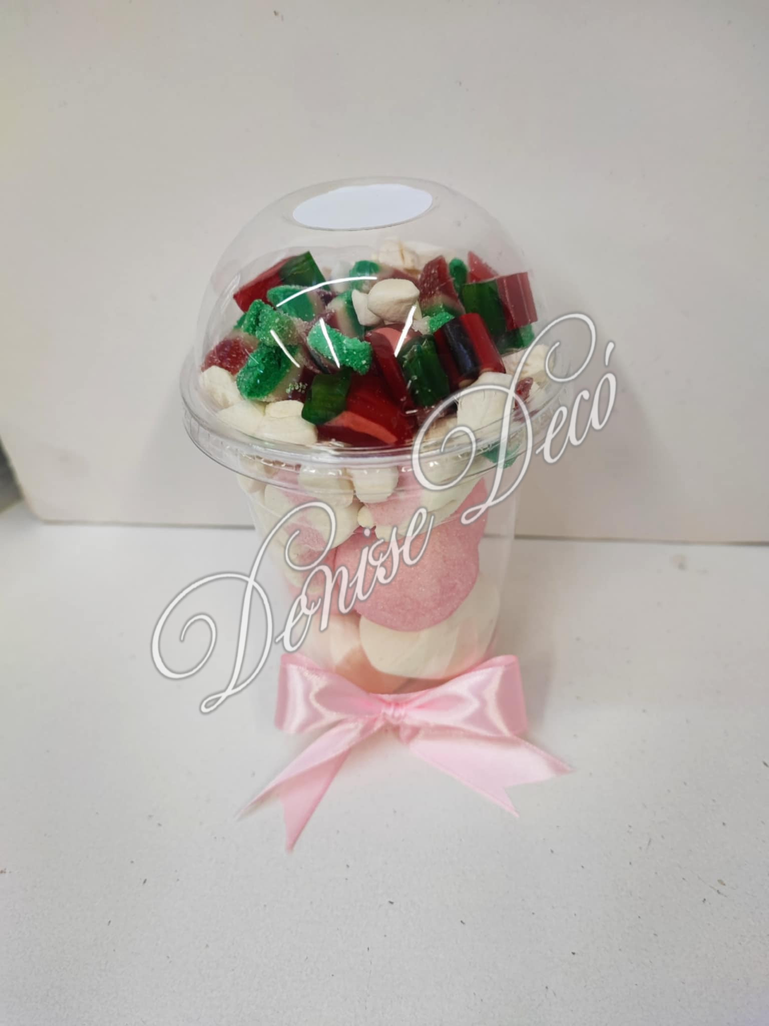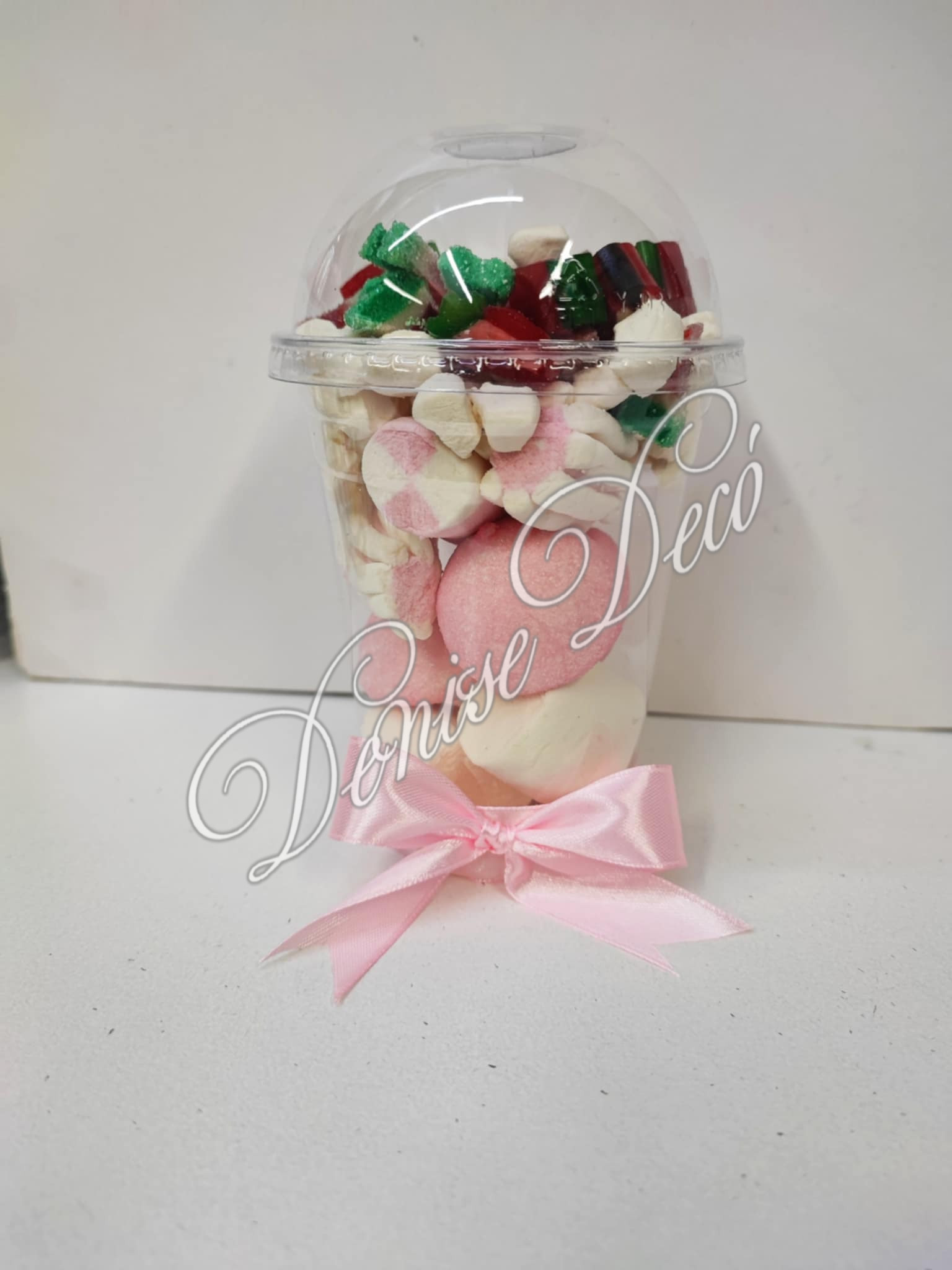 Ποτηρι Ζαχαρωτων που αποτελειται απο ζελεδακια και Marshmallow,κουφετακια δημητριακων,σμαρτις και διαφορα ακομα ζαχαρωτων εποχης δινοντας μια εντυπωσιακη εικονα στο τραπεζι ζαχαρωτων τον καλεσμενων σας και ενθουσιασμο στους μικρους καλεσμενουςν σας. Θα δημιουργησουμε για εσας τα κερασματα σας βαση το φυλλο του παιδιου και θα ταιριαξουμε τους αντιστοιχους χρωματισμους στο κορδελακι