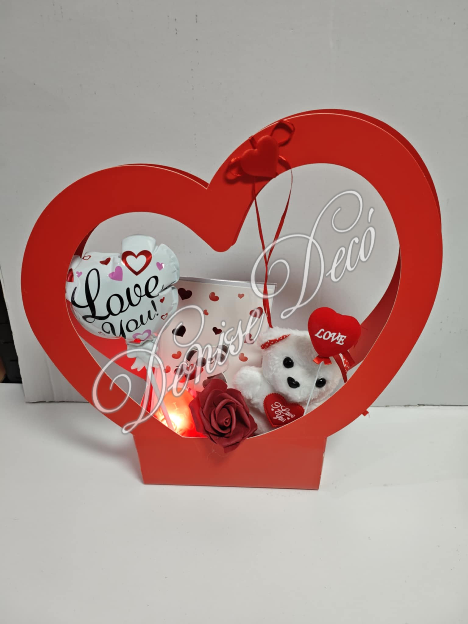 Σετ δωρου Αγαπης που περιλαμβανει , Καρτα ευχων αγ Βαλεντινου, Υφασματινα τριανταφυλλα,μπαλονακι καρδουλα, σοκολατα Lacta, κουπα πορσελανης με κουταλακι,λουτρινο αρκουδακι, Τοποθετημενα και διακοσμημενα σε χαρτινο καλαθι διαστασεων 38Χ40 εκ σε σχημα καρδιας.