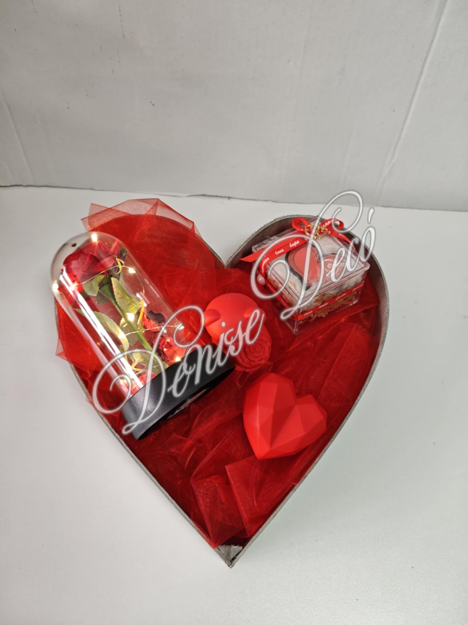 Σετ δωρου σε ξυλινο κουτι με σχεδιο καρδιας, που περιλαμβανει καμπανουλα με τριανταφυλλο και led ,κουτακι με μπρελοκ καρδουλα φωτιζομενα διακοσμητικα αρκουδακι και καρδουλα