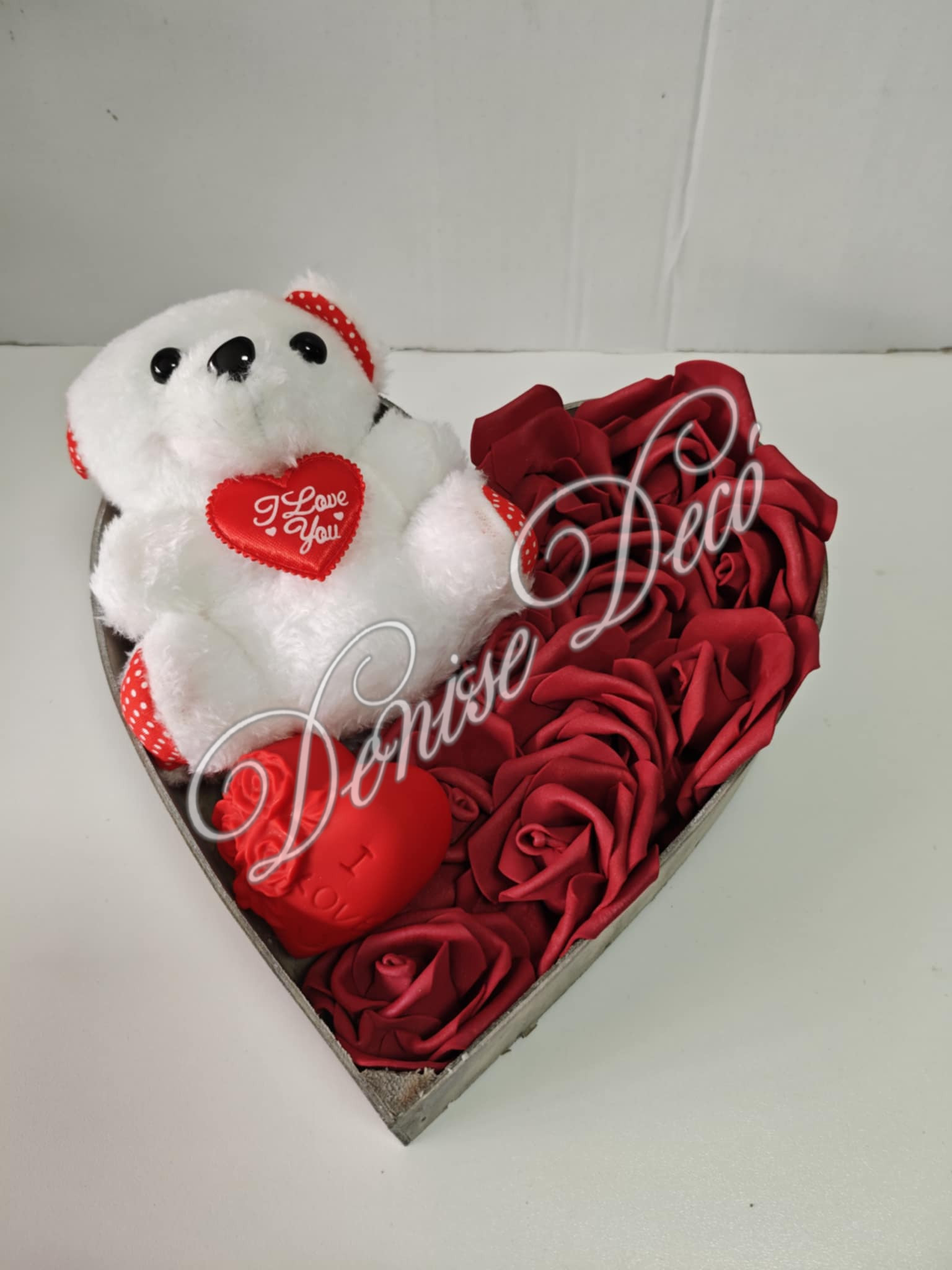 Σετ δωρου σε ξυλινη καρδουλα μεσα στην οποια υπαρχει αρκουδακι με διακοσμηση τριανταφυλλων και φωτιζομενη καρδουλα