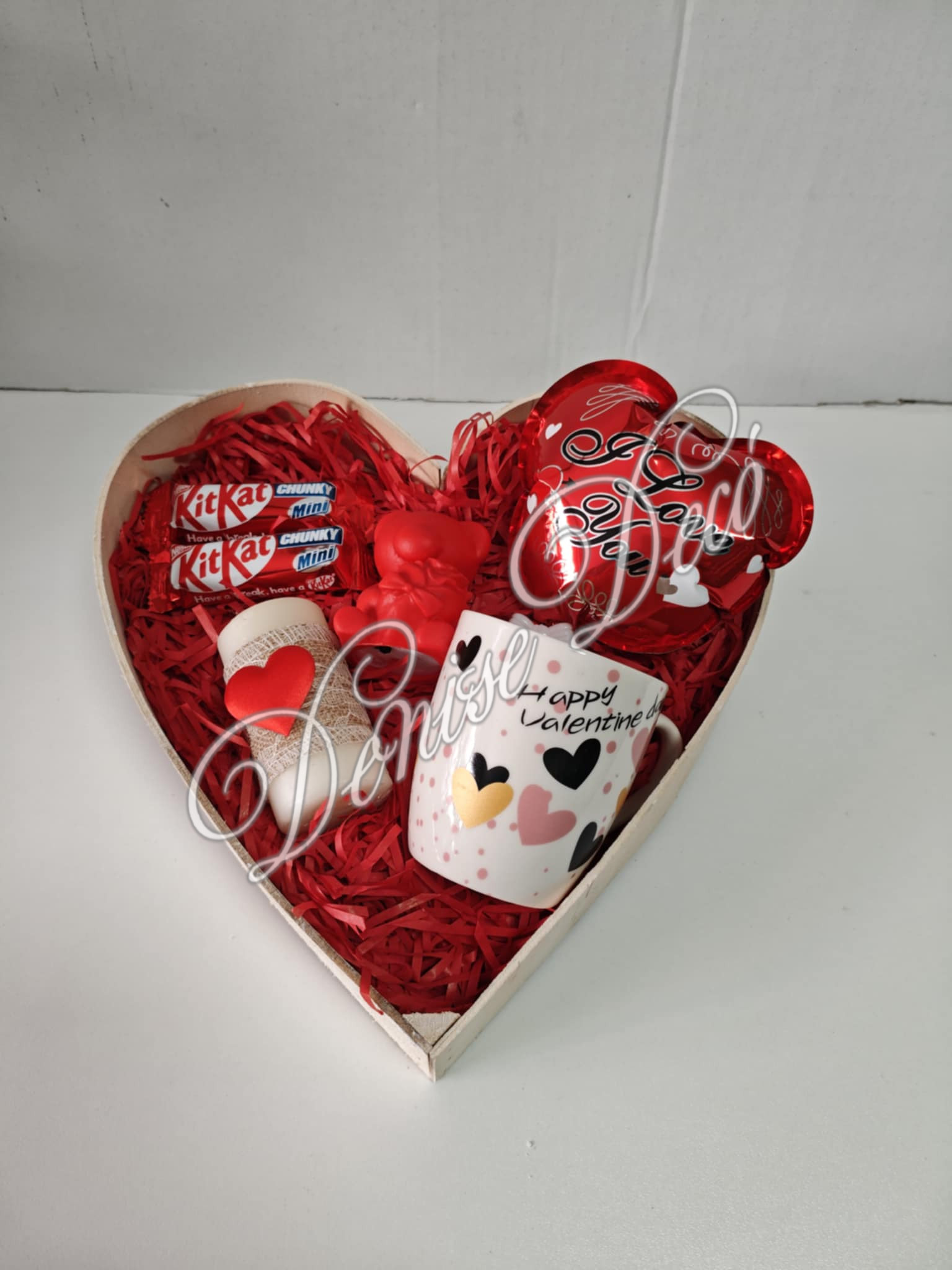 Σετ δωρου που περιλαμβανει κεραμικη κουπα ευχων κερακι με διακοσμημημενη καρδουλα,σοκολατακια,μπαλονακι και φωτιζομενο αρκουδακι. Συγκεντρωμενα μεσα σε ξυλινο κουτι με σχημα καρδιας