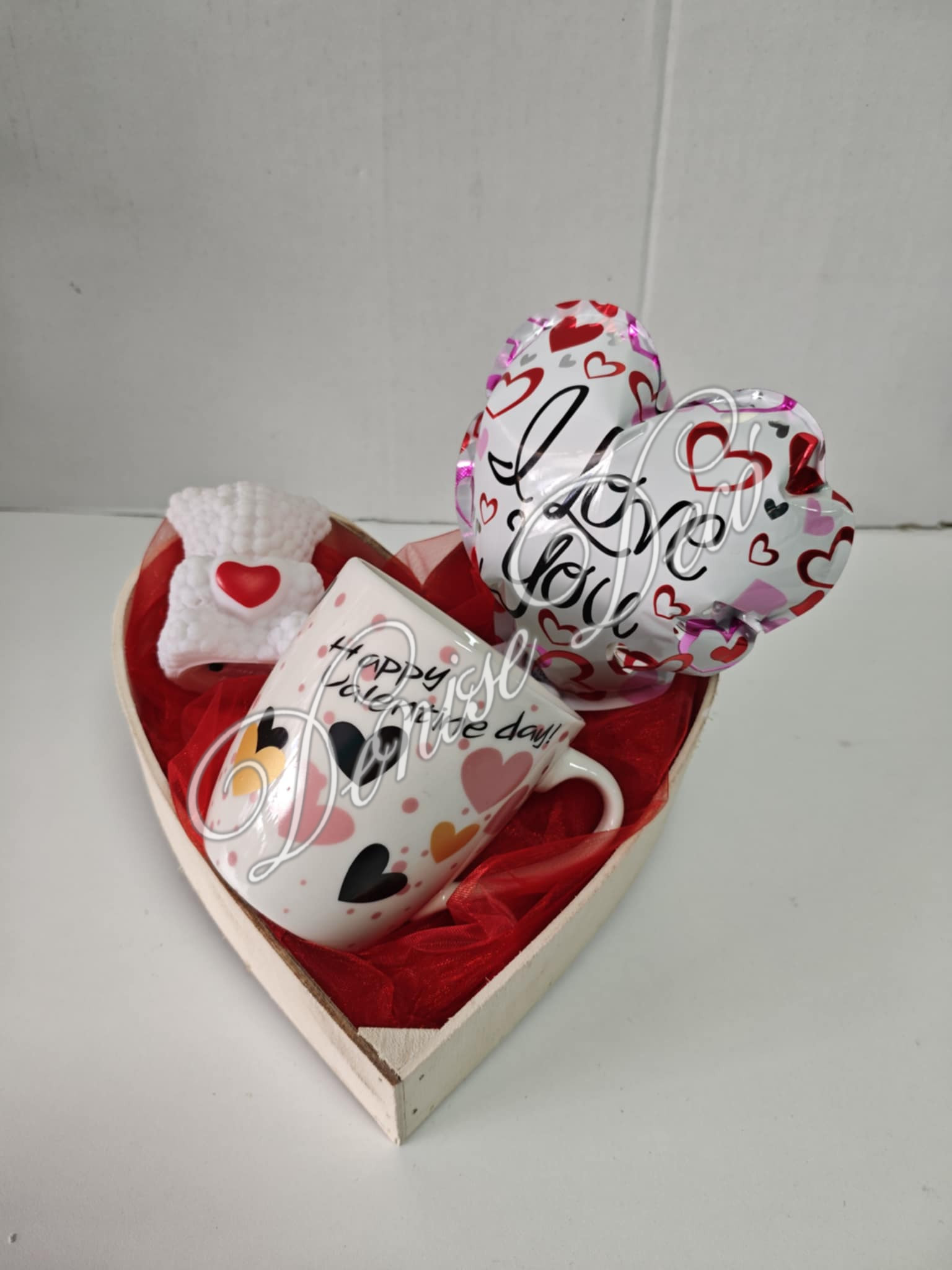 Σετ δωρου με κεραμικη κουπα γεματη καρδουλε και ευχη, μπαλονακι αγαπης και σοκολατιτσα lacta και φωτιζομενο διακοσμητικο, μεσα σε ξυλινη καρδουλα