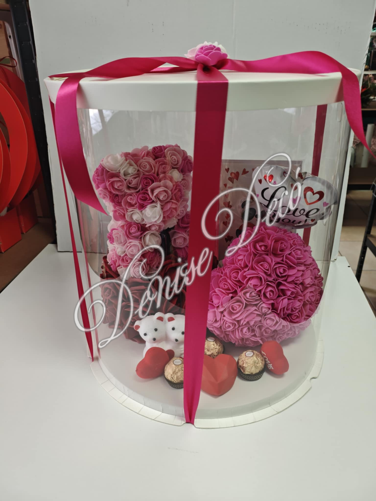 Σετ δωρου ακρως εντυπωσιακο συσκευασμενο μεσα σε διαφανο κουτι υψους 40 εκ, περιλαμβανει αρκουδακι rose bear σε ροζ αποχρωσεις λουλουδιων, διακοσμητικα μπαλονακια καρτα ευχων σοκολατακια ferrero διακοσμητικο φωτιζομενο με αρκουδακια,και μια φωτιζομενη καρδουλα, καρδια rose με φουξ αποχρωση.